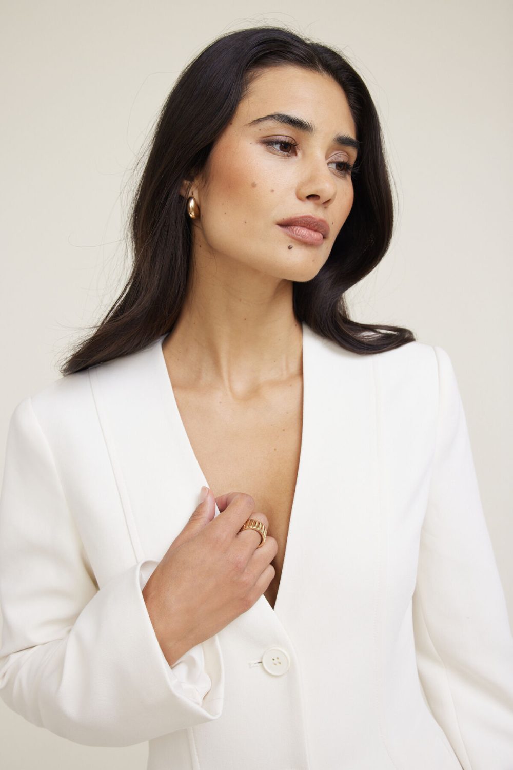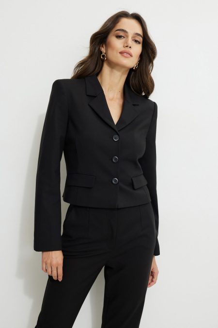 This woven blazer is designed to have a flattering hourglass fit. Style it with a tank top for an on-the-go look.