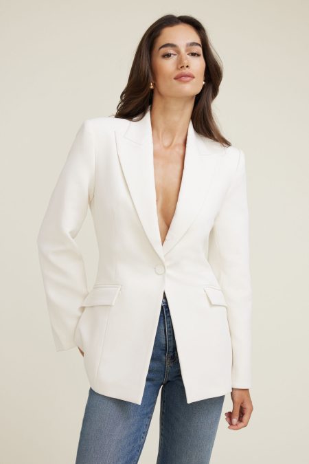 For the office and after—this fitted woven blazer is designed to compliment your form. Features Peaked lapel Button closure Darts at waist Padded shoulders Vented cuffs Lined Size & Fit Fitted Stretch fabric Model is wearing size XS Materials & Care 40% Polyester, 30% Recycled Polyester, 23% Rayon, 7% Spandex…